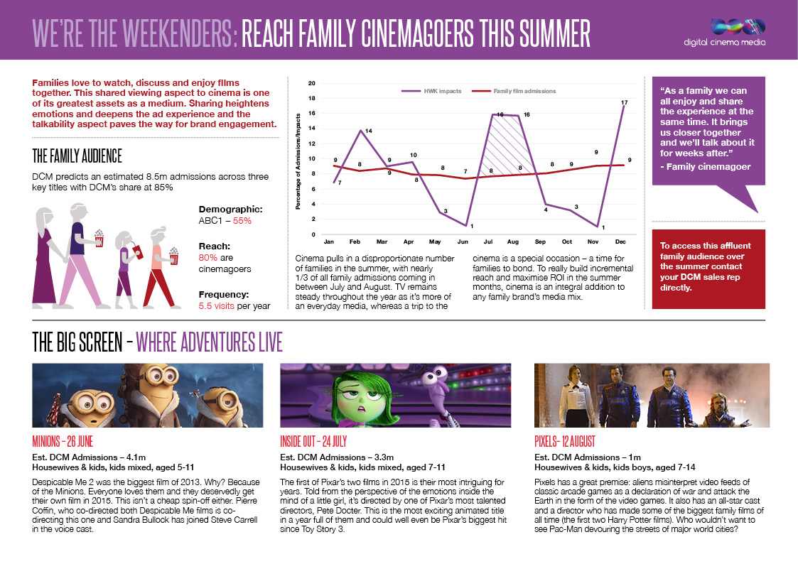 With July’s AB deadline now fast approaching, it’s worth noting that cinema’s price point stays fixed no matter how close to the campaign start date you book your campaign. With over 8.5m family admissions forecast over the summer period, and a 6% audience increase since 2010, there is no better place to be seen or better time to be onscreen this summer, when nearly a third of all cinema admissions will be from family films in the most immersive, impactful environment.